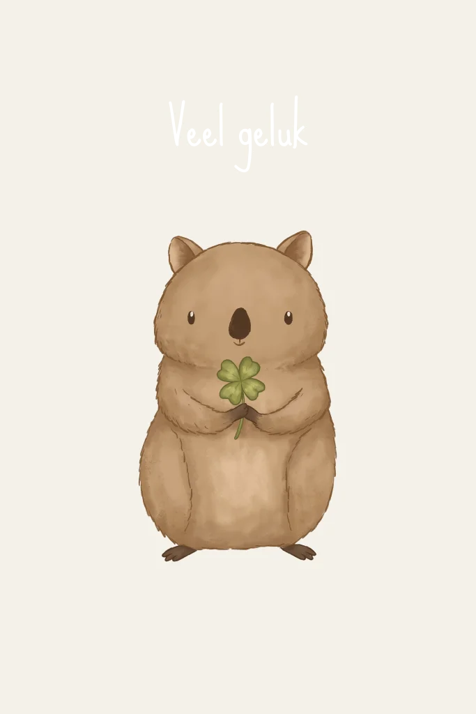 Wenskaart met een quokka die een klavertje vier vasthoudt. Een lief kaartje om iemand geluk te wensen! Pas het kaartje aan in de online editor.